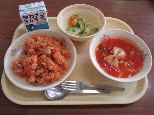 献立:チキンライス、トマトとパスタのスープ、フレンチサラダ、牛乳