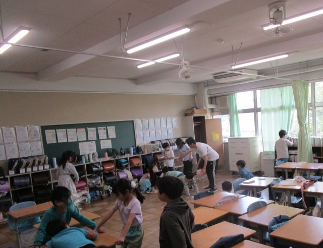 先生のリードの下、どのように清掃を行えばよいかつかみ、友達に声を掛け合い力を合わせて教室や廊下をきれいにしていました。