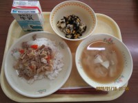 11(水)わかめごはん、いかの香味焼き、ポテト入りナムル、利休汁、牛乳 【入梅献立】