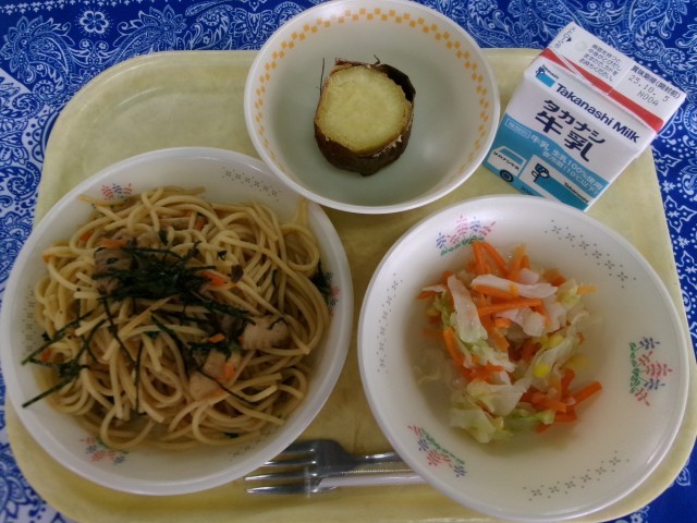 和風スパゲッティ、ハニーサラダ、焼き芋、牛乳