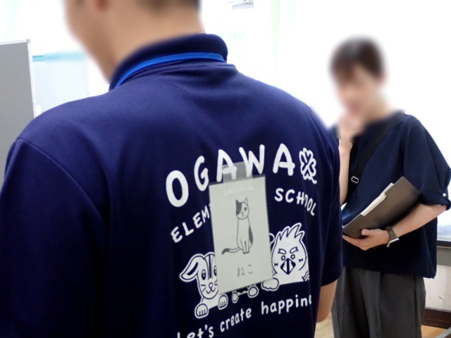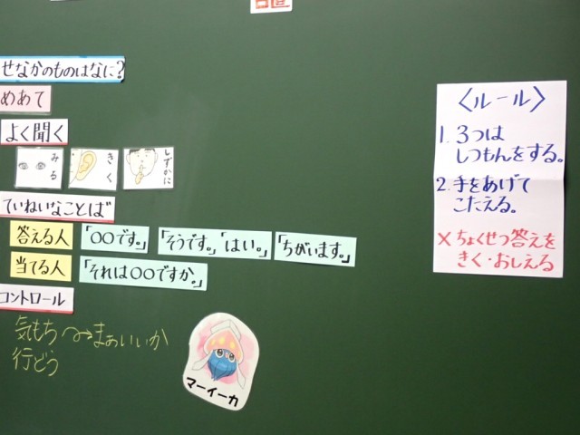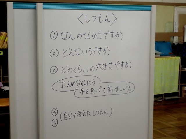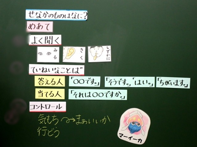 自分の背中に貼られたカードが何か、周りの友達に質問しながら、探り当てるゲームをしました。