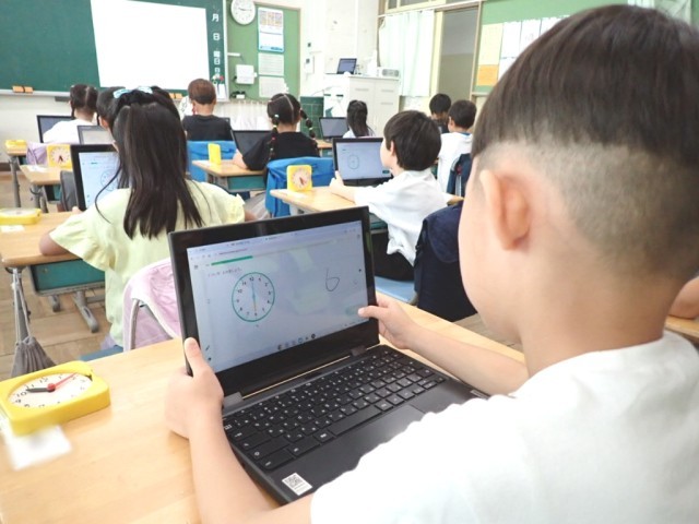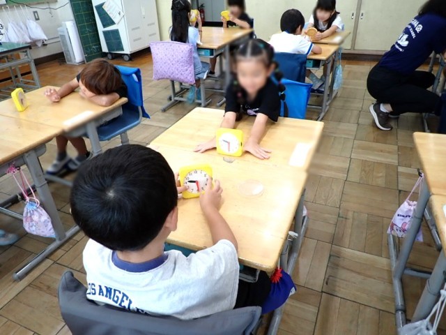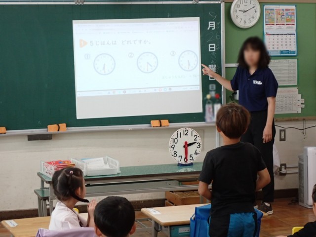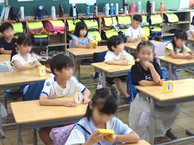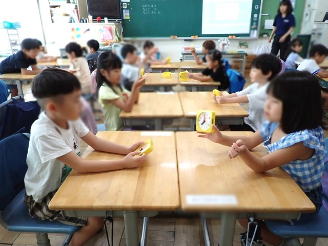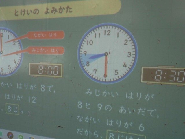 それから本題。今日は「なんじなんじはんめいじんになろう!」ということで、時計の模型を使って学習しました。お隣さんとペアになって問題を出し合い、楽しく何度も時計を読む練習をしました。