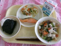 とりごぼうピラフ、さつ豆サラダ、ABCスープ、牛乳