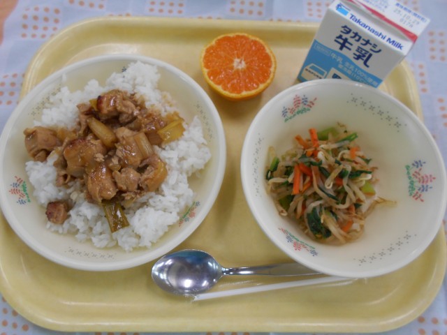 焼き鳥丼、おひたし、菊花みかん、牛乳