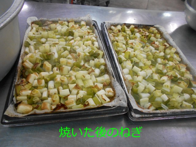 焼き鳥丼は、ご飯の上に 焼いたとり肉とねぎ をのせて、あまからいたれをかけた料理です。給食室では、大きなスチームコンベクションオーブンで、とり肉とねぎをこんがり焼いて、たれにからめて作っています。ご飯とお肉にたれがよく合って、とてもおいしい丼ぶりです。
