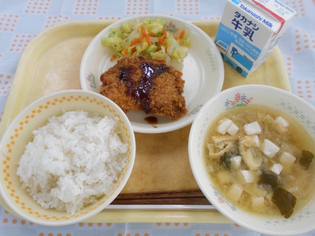 ご飯、とんかつ、即席漬け、豆腐とわかめのみそ汁、牛乳