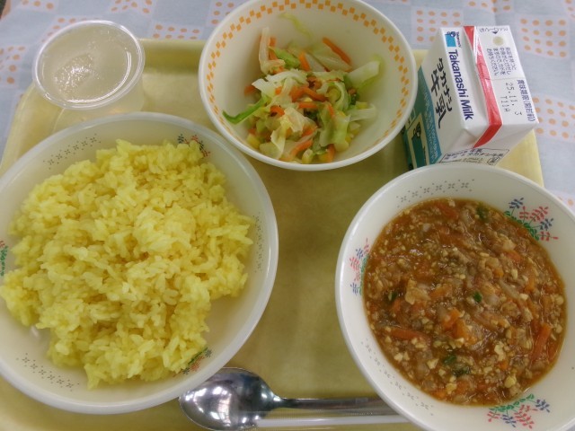ターメリックライス、ビーンズキーマカレー、カントリーサラダ、レモンスカッシュゼリー、牛乳