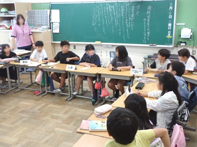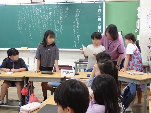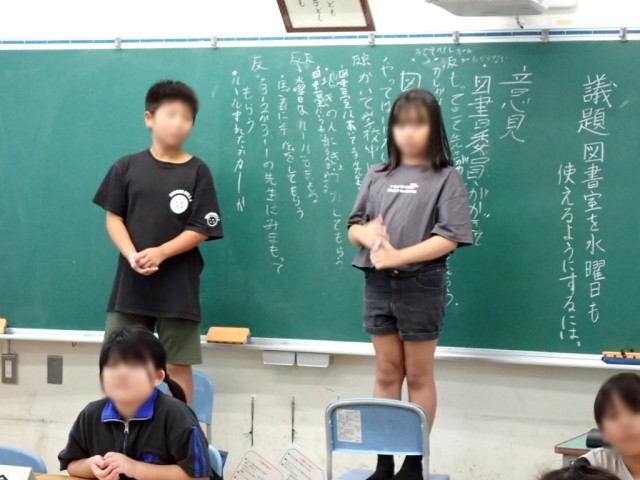 6校時、さっそく4年生では、「小川っ子議会」のテーマ「図書室を水曜日も使えるようにするには」について話し合っていました。