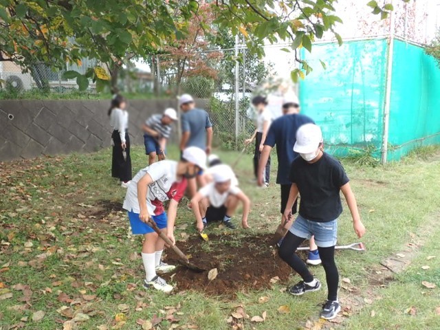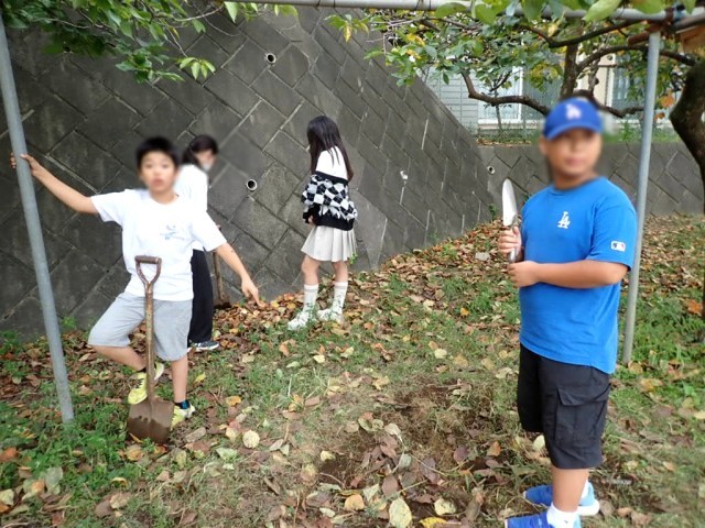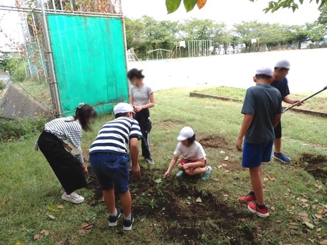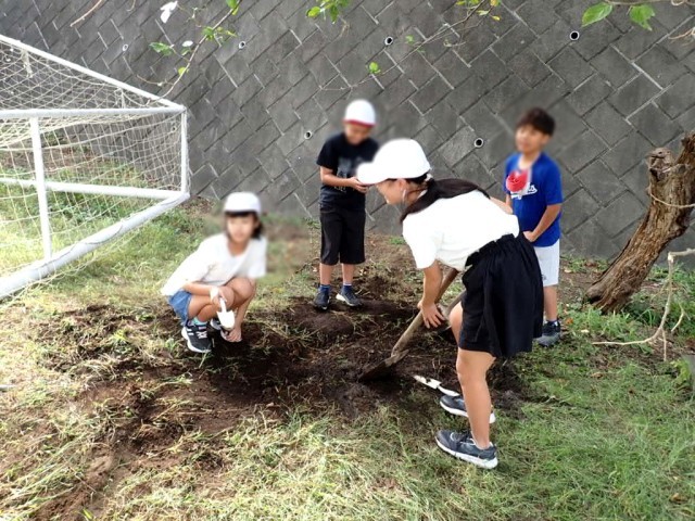 なんだか土を掘り返しているので、新しく畑でも作っているのかと思って行ってみたら、理科の地層の学習でした。