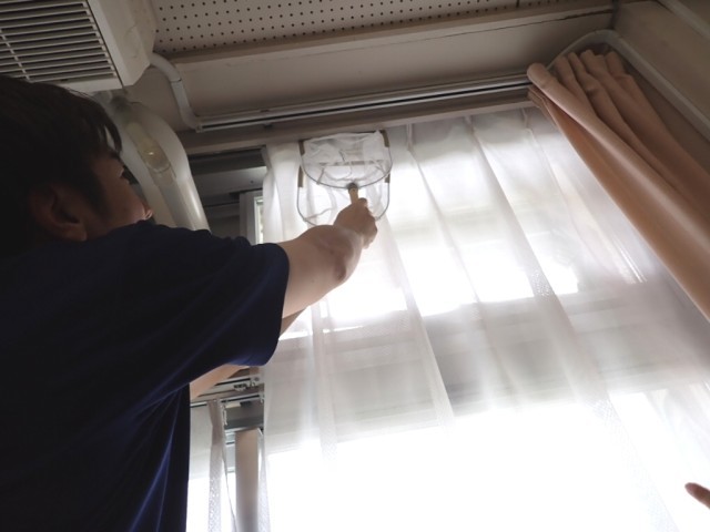 傷つけないように、カーテンにとまっているトンボを捕まえ、プラケースに入れて、プールに持っていきました。