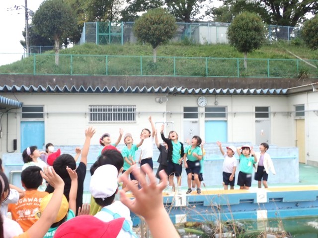 無事に、トンボの体を傷つけることなく、放すことができましたが、あっという間に上の方、校舎の方へ飛んで行ってしまいました…お相手を見つけて、プールに戻ってきてくれるといいなと思います。