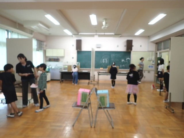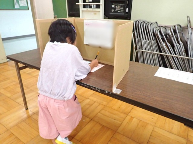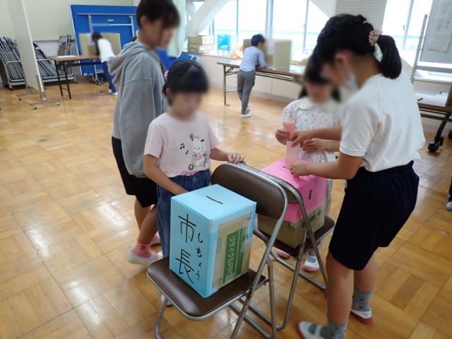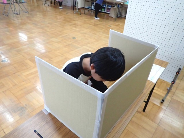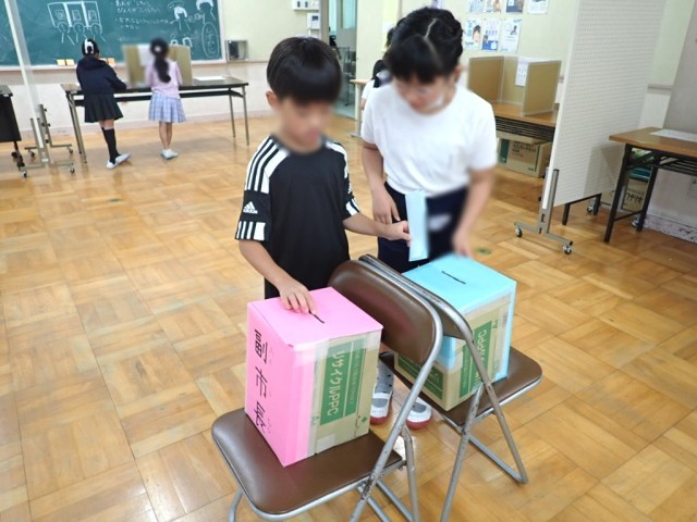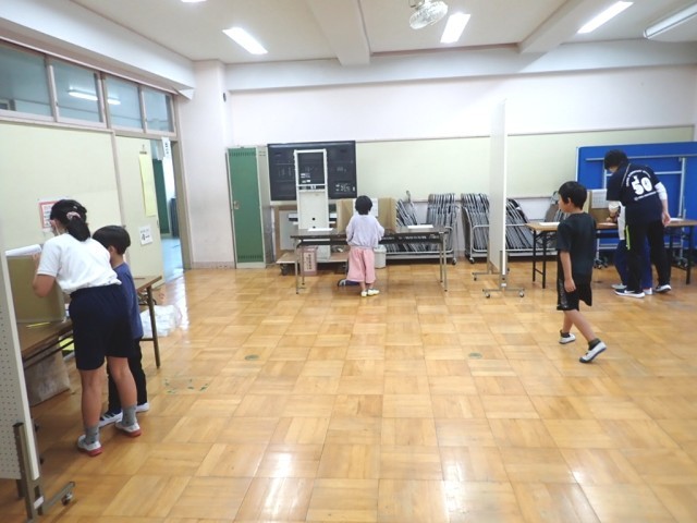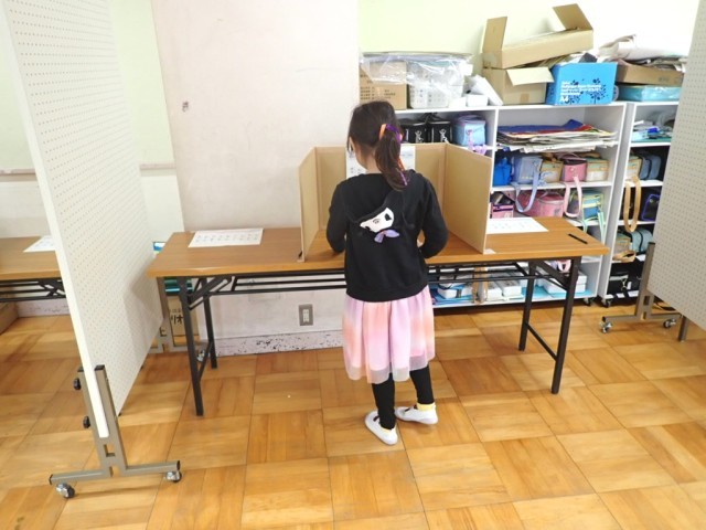 選挙管理委員のこどもたちが、低学年でも分かるようにガイドして、本物の投票所のように運営しています。