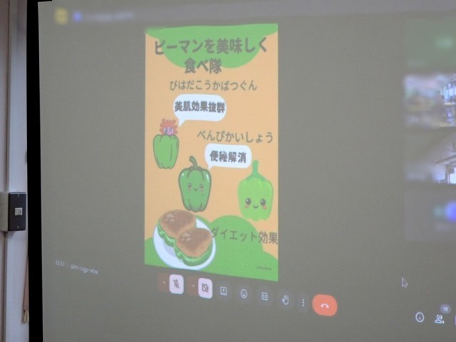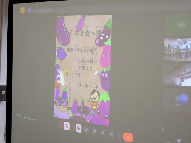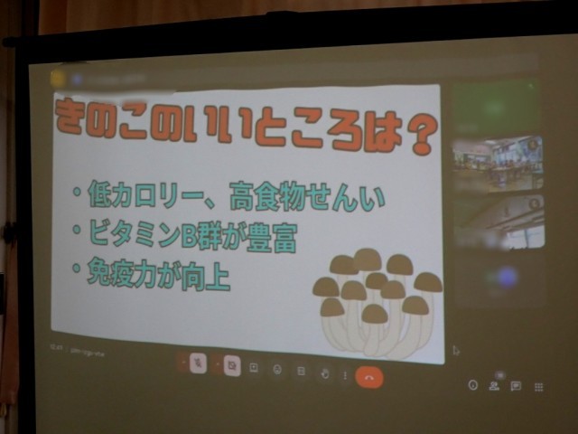 こどもの苦手な食べ物の定番、キノコ、ピーマン、ナスについて、栄養価やオススメの調理法等を、クイズを交えながら楽しく伝えてくれました。