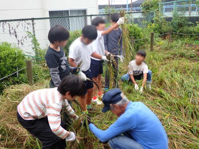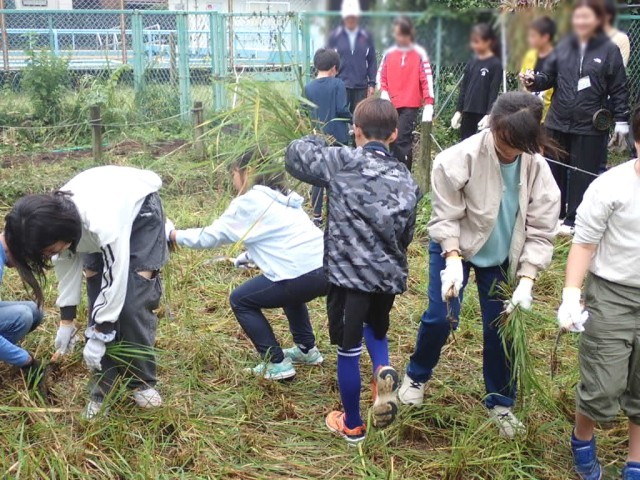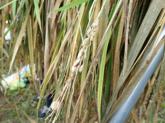 枯れてしまった稲も多く、それらを取り除いて、残った緑色の元気そうな部分を刈って、Learning Crewの皆さんに、束にしていただきました。