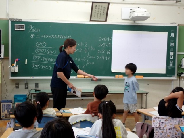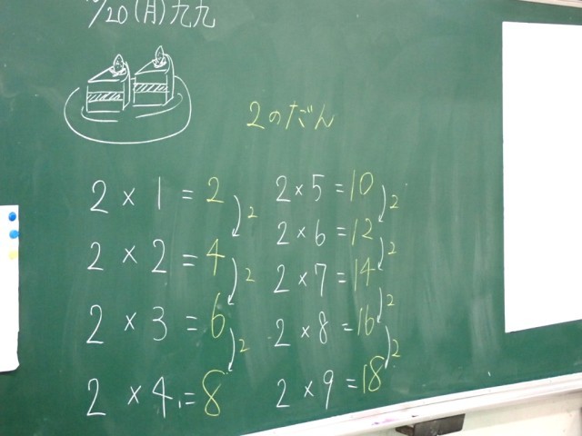 九九の仕組みについて学んだ後は、隣同士でかわりばんこに言ったり、班で問題を出し合ったり、とにかくたくさん声に出して練習をしていました。