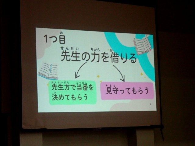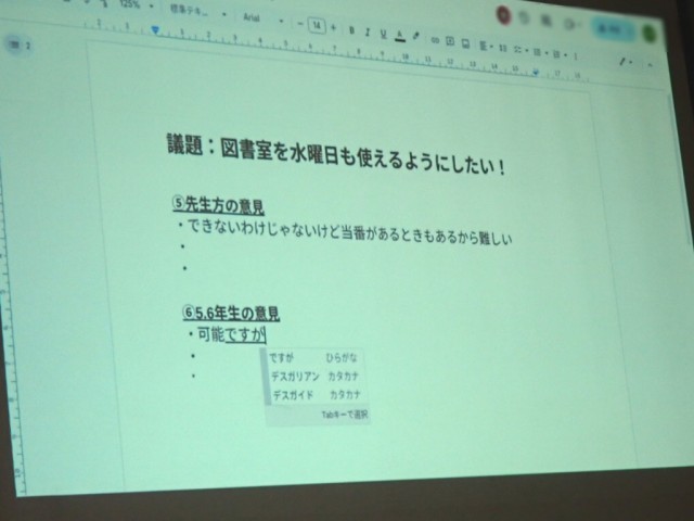 先生やこどもたちが意見を発表し、それをリアルタイムでスクリーンに打ち込んでいきます。