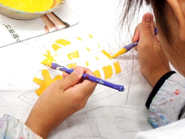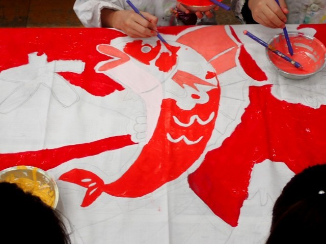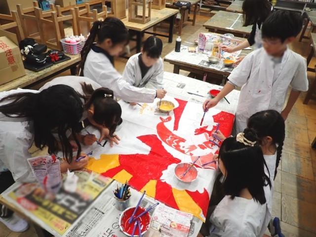 「図工室にも行ってみてください」と言うので行ってみると、ソーラン節で使う大漁旗を描いていました。