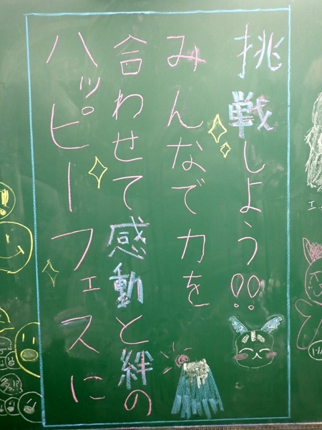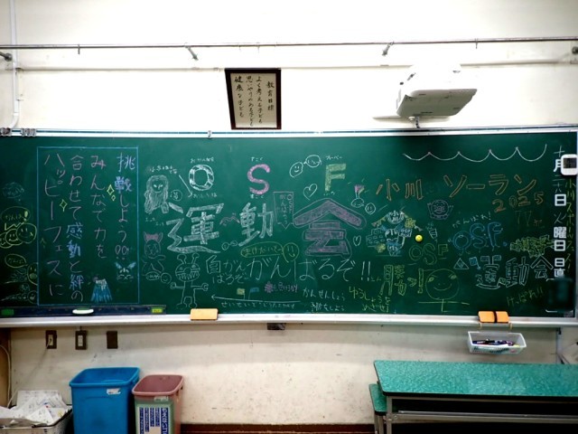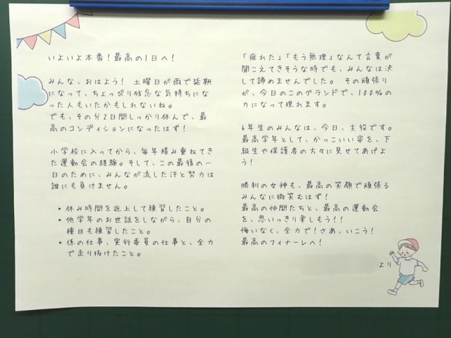 最後の2枚は、6年生の教室。3教室とも同じ。担任らからのメッセージ。こどもたちは、これを読んで、小学校生活最後の運動会本番に向かったのでしょう。