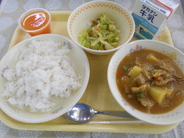 麦ご飯、米粉のポークカレー、キャベツの福神漬け、キャロットゼリー、牛乳