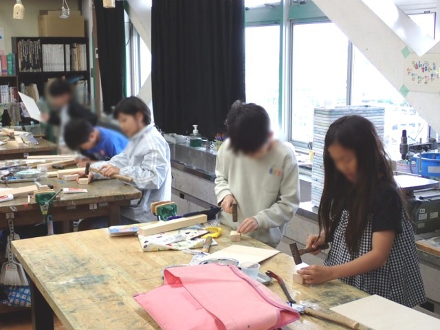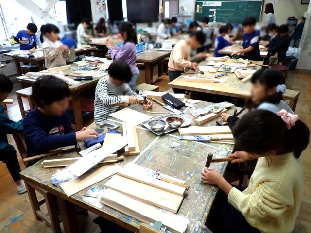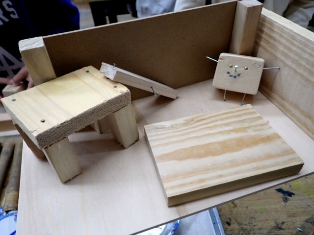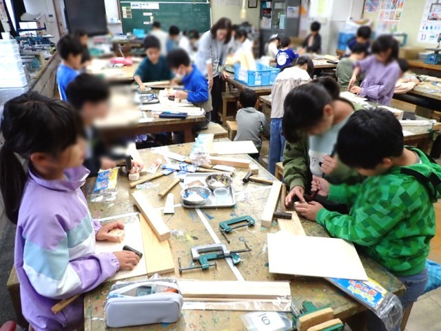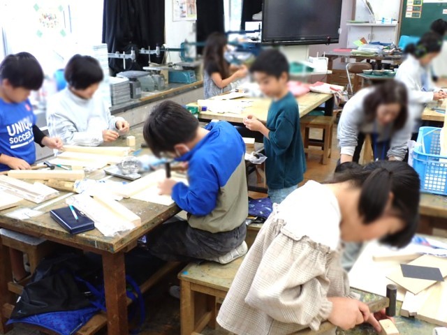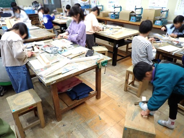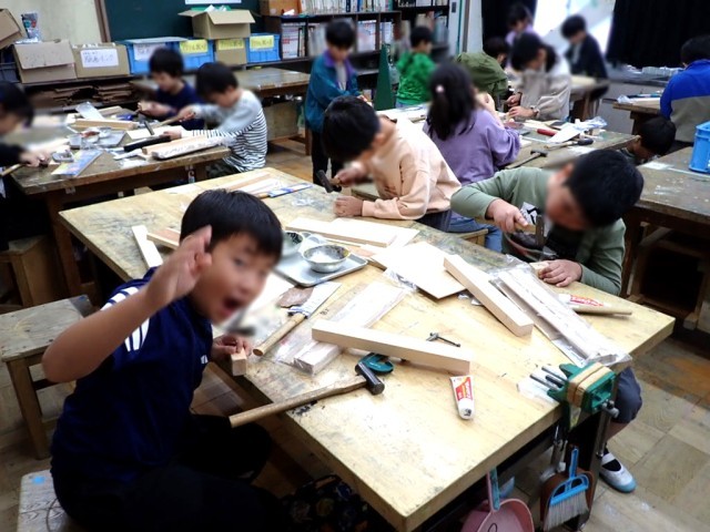 コッパ(木っ端)くんの秘密基地というテーマで、木を使って工作していました。熱中しています。