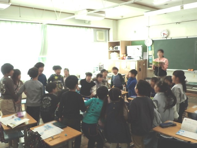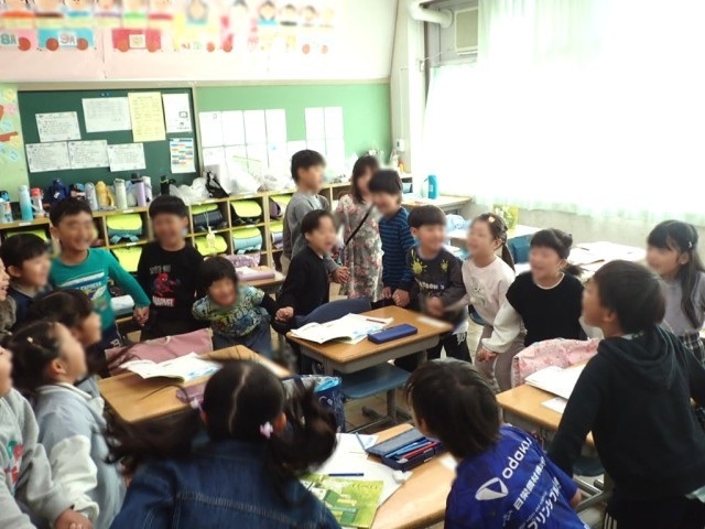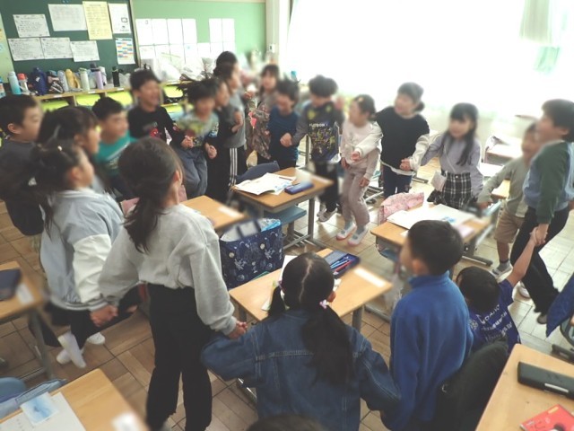 お話に書いてあったことを実際にみんなでやってみよう!ということで、教室の真ん中で手をつないで、思い切ってジャンプしていました。