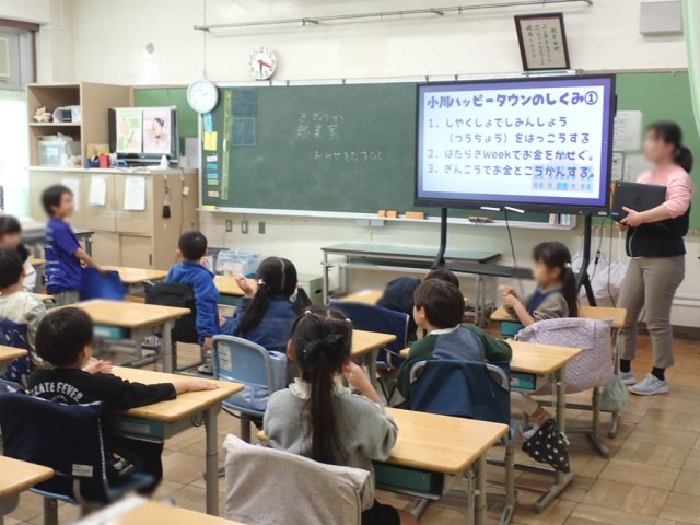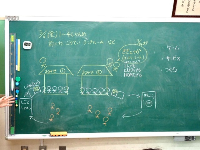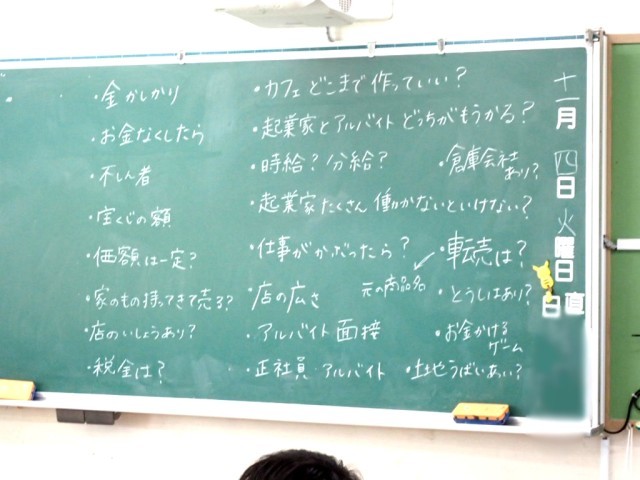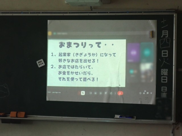 今日は、起業家(出店する人)についての説明がありました。誰でも、誰とでも、起業家になって出店することができます。「起業家になりたい人?」と訊くと、どのクラスでも多くの子が出店したい!と手を挙げていました。