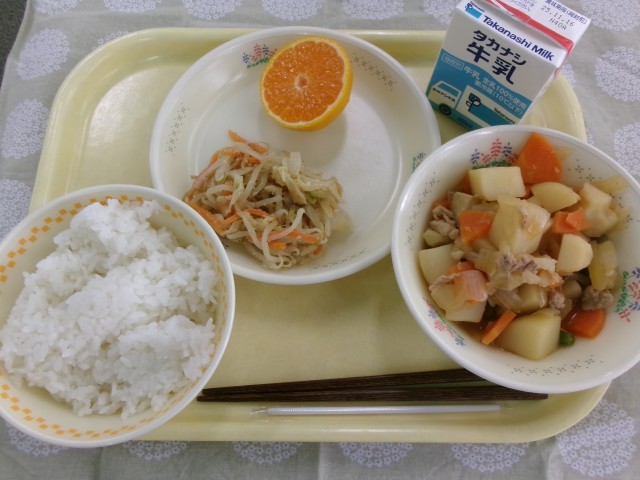 ご飯、肉じゃがうまに、ごまあえ、菊花みかん、牛乳