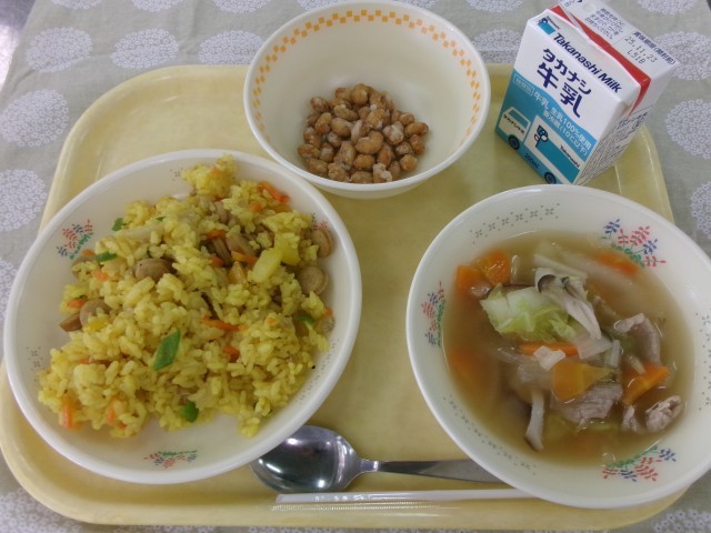 メキシカンライス、フライビーンズ、秋野菜のスープ、牛乳