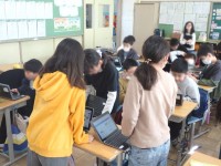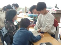 収穫祭に向けて、いつものように地域の方が早めに来てくださり、落ち葉を掃いていたら、1年生が「やるー」と言って手伝ってくれました。