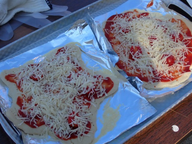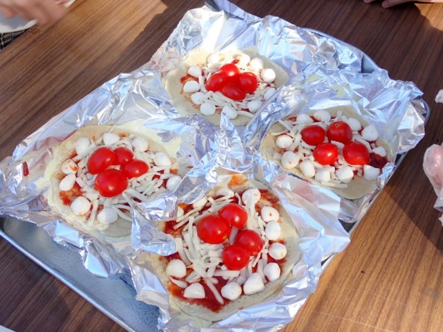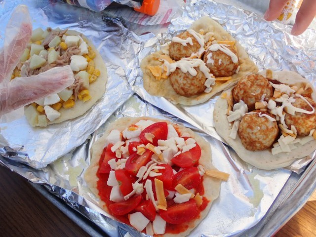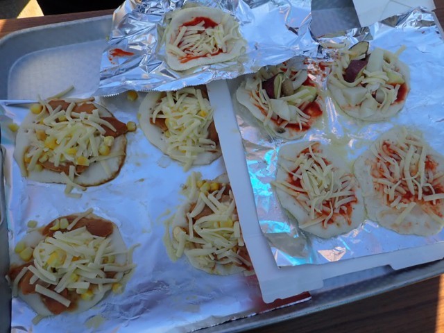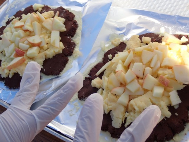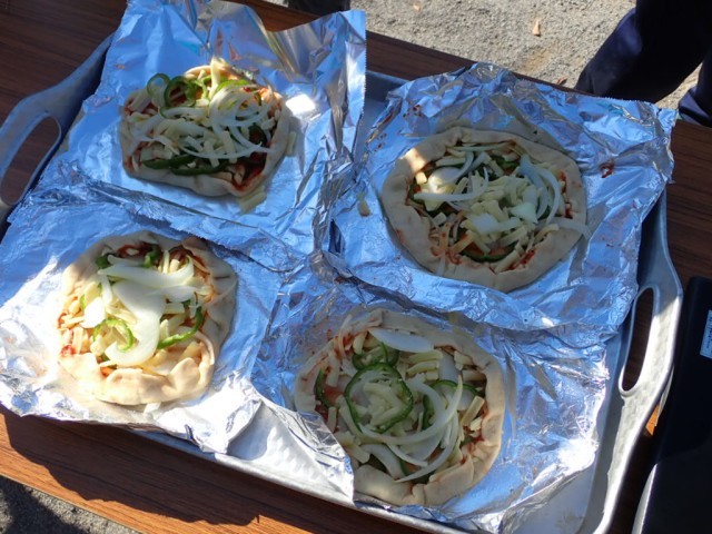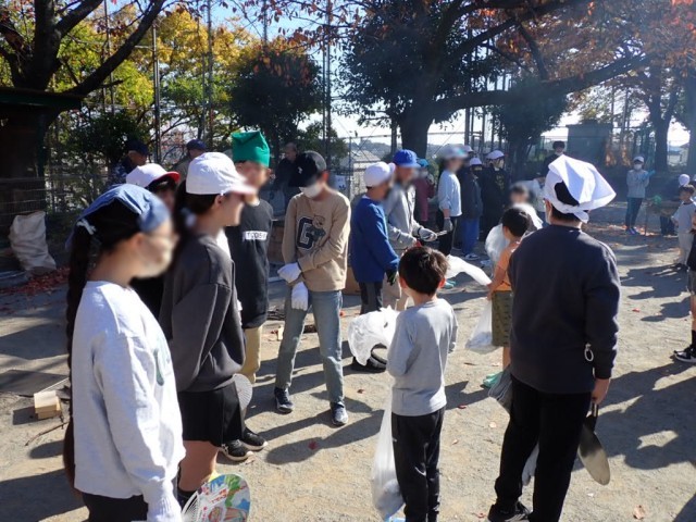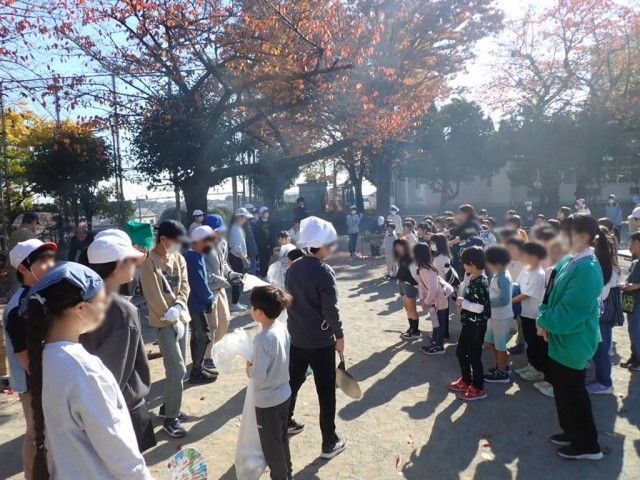 2年生が、新聞紙とアルミホイルで包んだサツマイモを、6年生に託します。美味しく焼いてください!