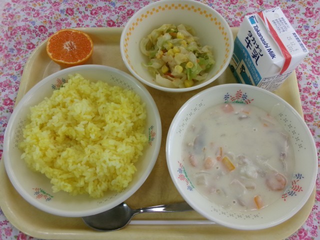 ターメリックライス、えびクリームソース、グリーンサラダ、菊花みかん、牛乳