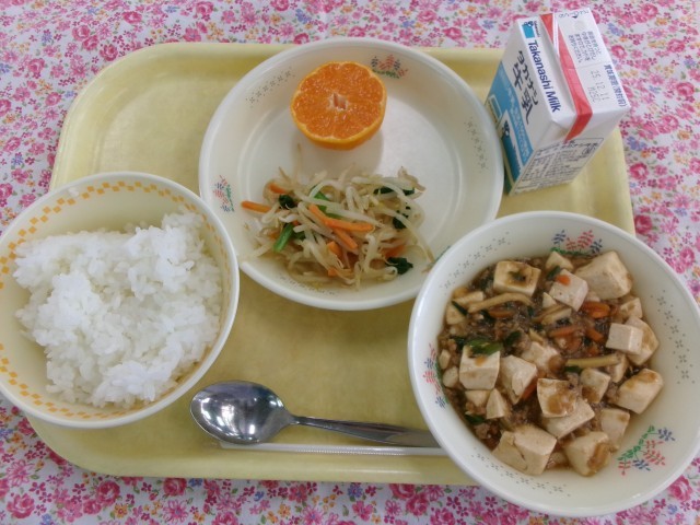 ご飯、麻婆豆腐、中華和え、菊花みかん、牛乳