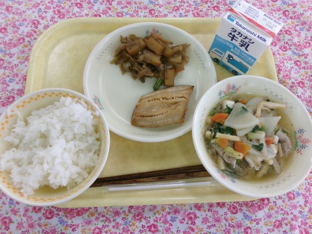 ご飯、ほっけのみりん焼き、五目きんぴら煮、豚汁、牛乳