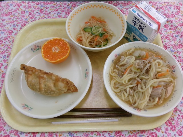 あんかけラーメン、ジャンボぎょうざ、バンサンスー、菊花みかん、牛乳