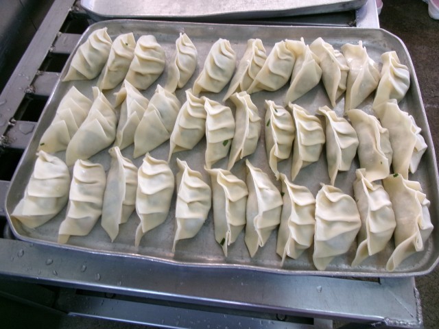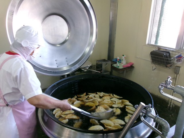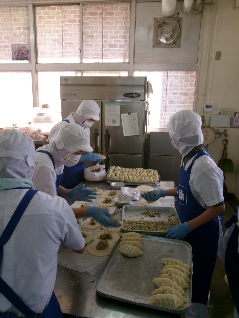 三日月のような半円形をしているぎょうざが多いのは、中国で使われていたお金が半円形だったことが由来しています。ジャンボぎょうざは調理員さんたちも好きな料理です。一つ一つ丁寧に皮で具を包み、油で揚げて作りました。ぎょうざの皮は、直径15cmのものを使っています。