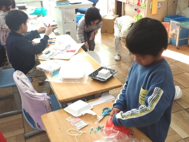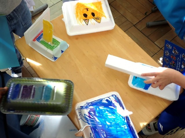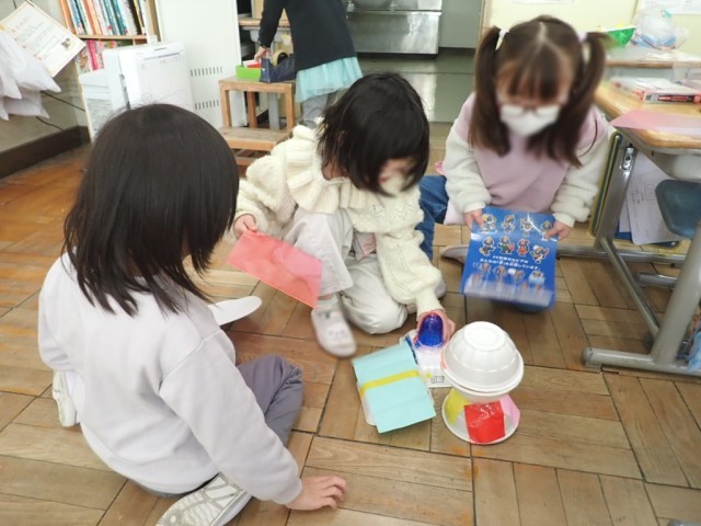 下敷きで風を起こして、おもちゃを前に進めたり、友だち同士で押し合いっこをしたりして遊んでいました。とっても盛り上がっていました!