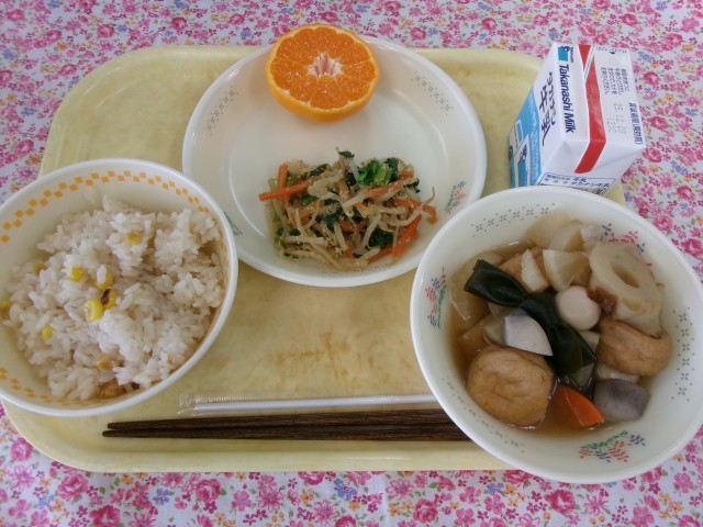 コーン茶飯、おでん、ごまあえ、菊花みかん、牛乳