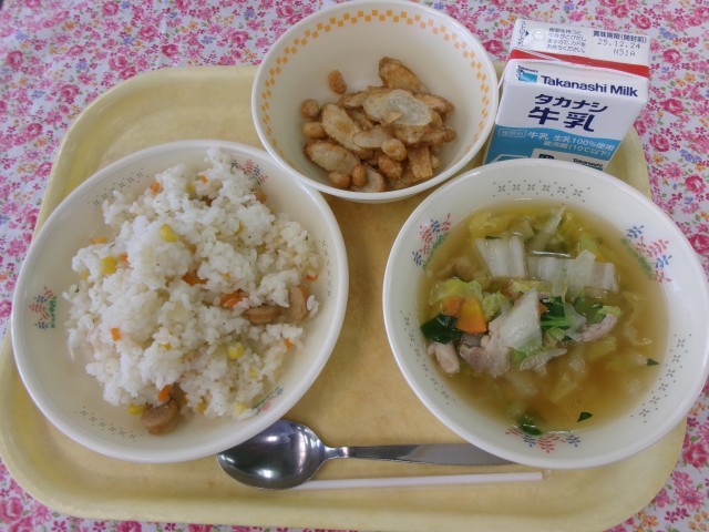 コーンとウインナーのピラフ、ごぼうと大豆の甘辛揚げ、白菜とベーコンのスープ、牛乳
