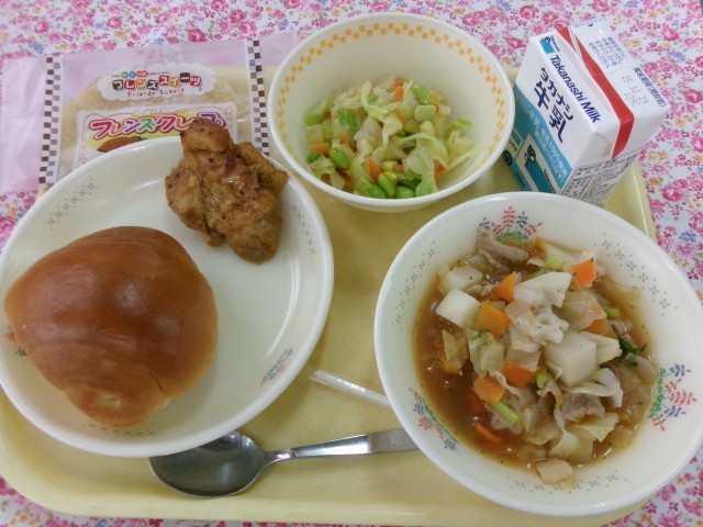 バターロール、タンドリーチキン、グリーンサラダ、星パスタ入りミネストローネ、デザート、牛乳