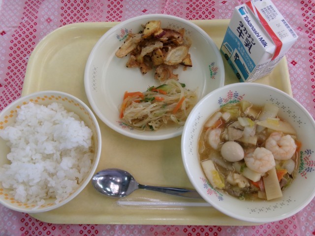 ご飯、八宝菜、バンサンスー、野菜のかりんとう風、牛乳