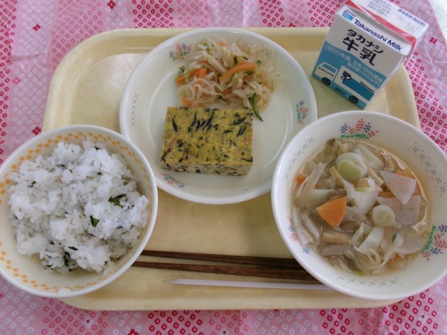 わかめご飯、五目卵焼き、シャキシャキ梅サラダ、利休汁、牛乳