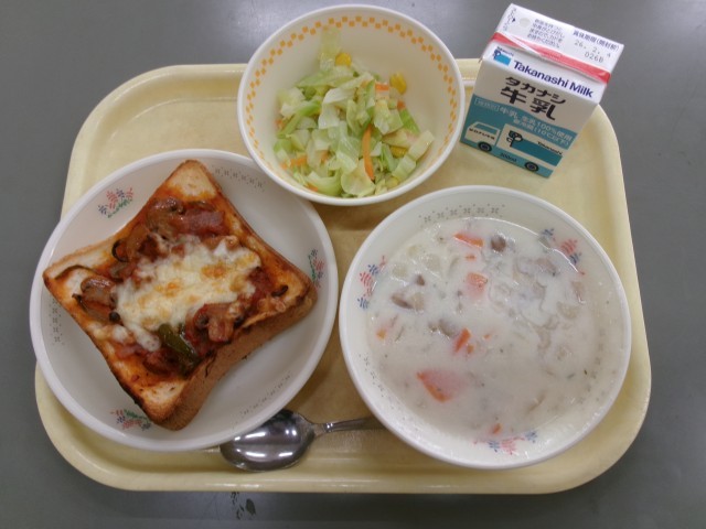 ピザトースト、ハニーサラダ、チキンのクリーム煮、牛乳