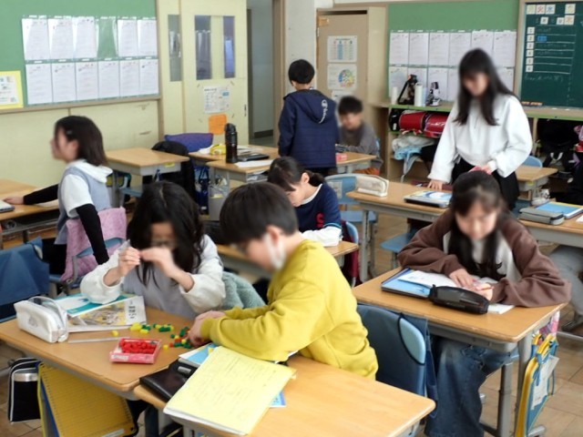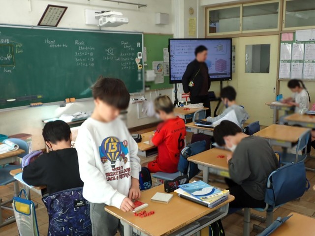 算数は体積の学習。小さなブロックを使って学んでいました。
