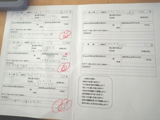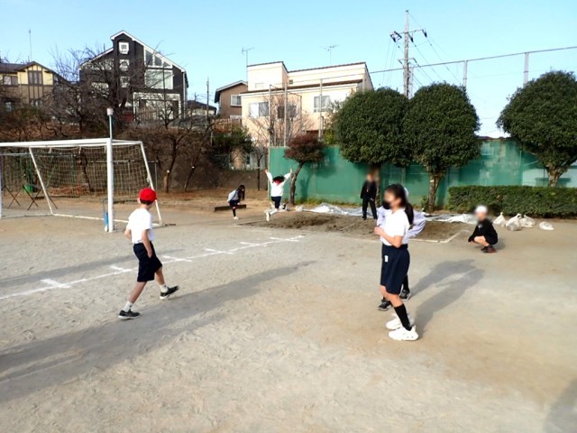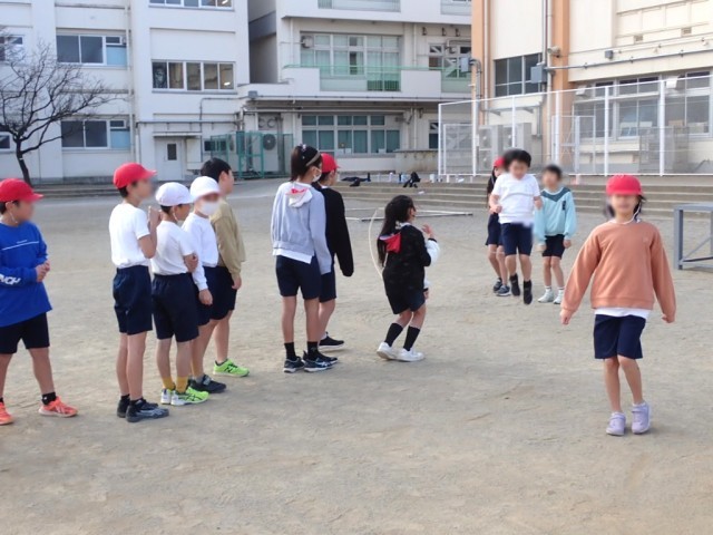 教室で動画を使いながらポイントを学び、めあてを書いた後は外へ。大縄の練習もしつつ、砂場で走り幅跳びをしました。