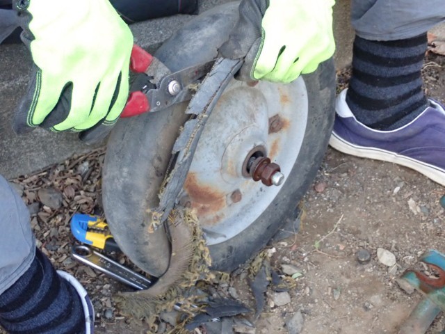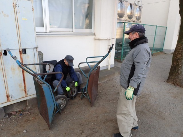 今日は、主事さんが主に使っている一輪車のタイヤを修理してくれました。