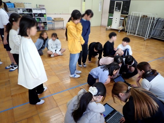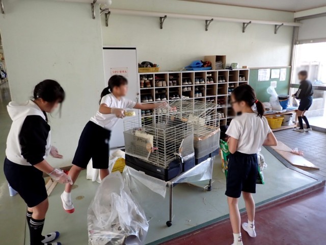 飼育委員さんたちによる、モルモットのおうちのお掃除