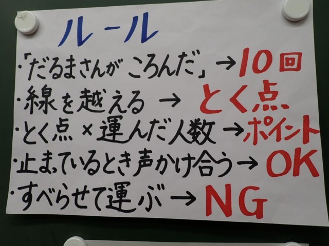 10回、「だるまさんがころんだ」をする間に、どれだけのモノを運べるか、挑戦です。