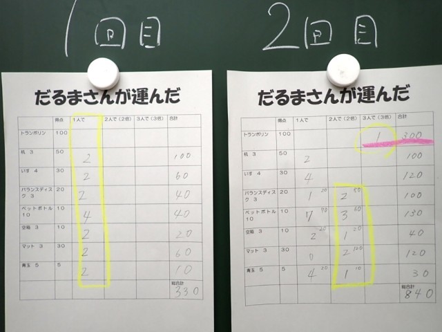 1回目は全く協力がなく、一人一人が運んでいましたが、2回目は協力技もたくさんあって、高得点が出せました。