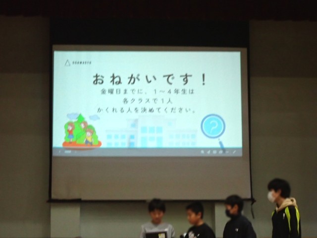 小川っ子議会で決まった、全校児童で行う「学校かくれんぼ」について、ハピハピ小川カンパニー(集会委員)が実施主体を担ってくれています。