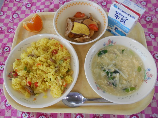 シーフードピラフ、フライドベジタブル、にんにくスープ、かんぺい、牛乳